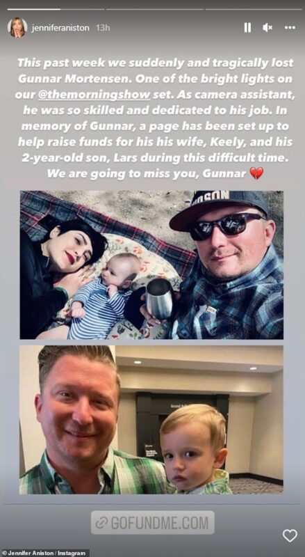 “La semana pasada perdimos repentina y trágicamente a Gunnar Mortenson. Como asistente de cámara, era muy hábil y dedicado a su trabajo. En memoria de Gunnar, se creó una página para ayudar a recaudar fondos para su esposa, Keely, y su hijo de 2 años, Lars, durante este momento difícil. Te vamos a extrañar Gunnar”, expresó Jennifer.