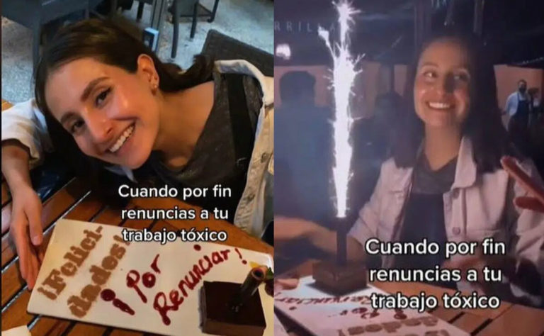 En las imágenes se aprecia a la joven con un pastel que dice “felicidades por renunciar” con una vela que saca chispas; asimismo, la grabación tiene una leyenda que dice “cuando por fin renuncias a tu trabajo tóxico”.