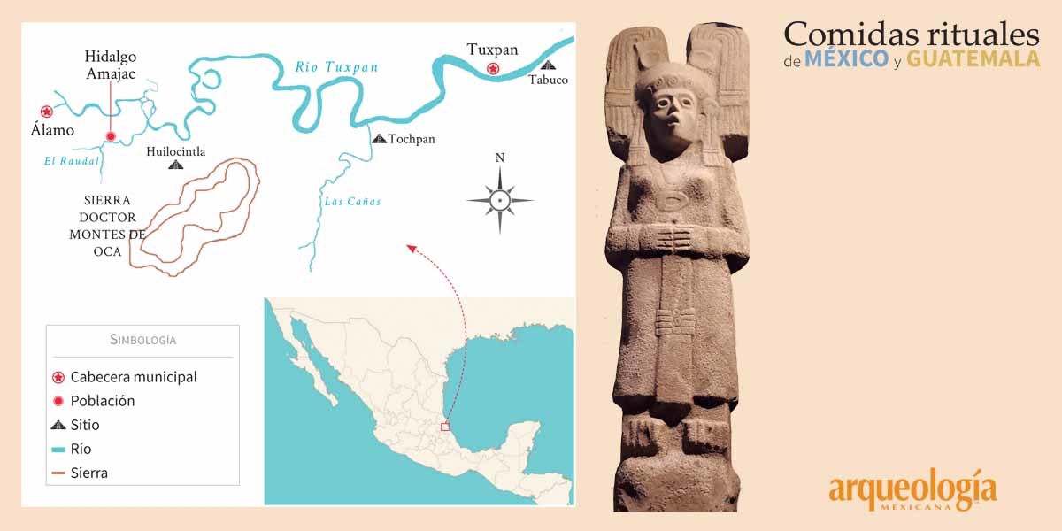 Imagen: Hidalgo Amajac, y otros sitios mencionados en el texto, ubicado sobre la cuenca media y baja del río Tuxpan. Elaboración: María Eugenia Maldonado Vite; Ilustración Digital: Raíces. Escultura femenina de Hidalgo Amajac, Veracruz, que representa a una joven gobernante con un tocado de dos mechones y un collar de oyohualli. Foto: María Eugenia Maldonado Vite.