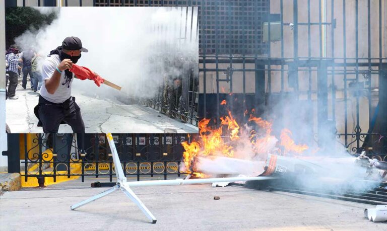 El incidente ocurrió cuando los miembros de la CETEG intentaron irrumpir en el inmueble, lo que provocó una respuesta inmediata por parte de los elementos de seguridad, quienes utilizaron extintores para dispersar a los manifestantes.