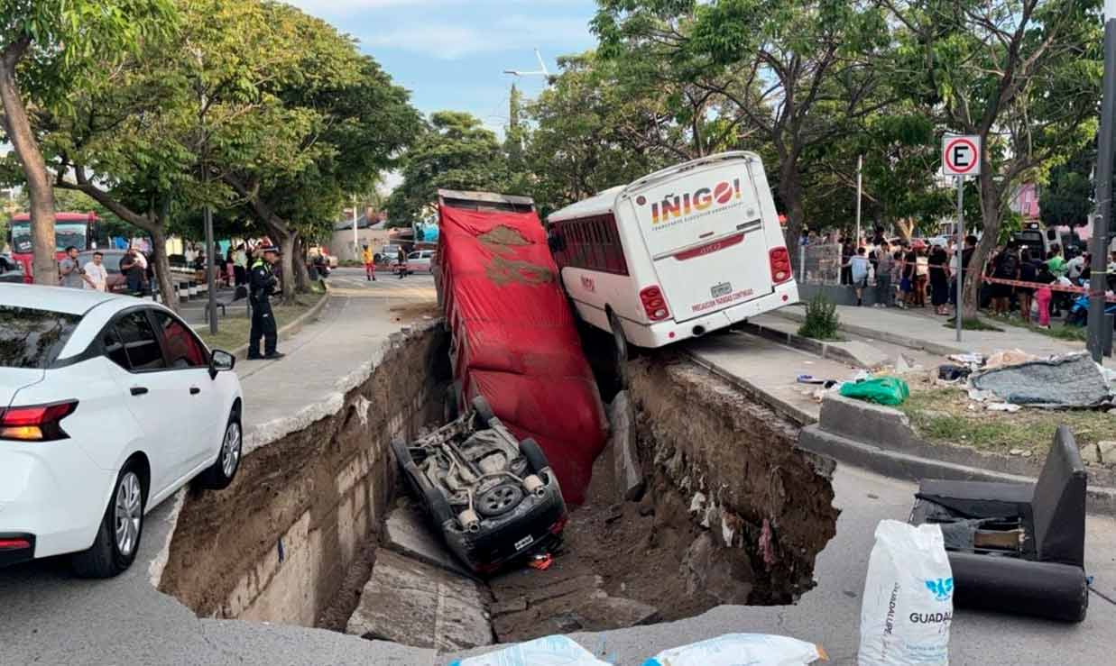 La magnitud del socavón fue tal que al menos tres unidades se vieron involucradas en el colapso del pavimento: un camión de carga que transportaba arena y que se precipitó al fondo del hoyo, un automóvil particular y un camión de transporte de personal con el logotipo de “Íñigo Transporte Empresarial”. A unos centímetros del borde quedó un auto blanco, con una de sus llantas suspendida en el aire, lo que subraya el riesgo extremo de la situación.