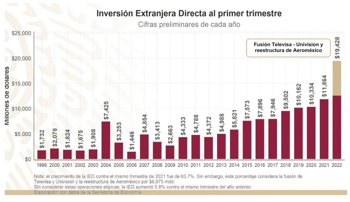 En conferencia de prensa matutina, el secretario Técnico del Gabinete de la Oficina de la Presidencia, Carlos Torres Rosas, informó que la Inversión Extranjera Directa al primer trimestre de 2022 registra una cifra récord superior a los 19 mil millones de dólares y, si se descuentan las operaciones atípicas empresariales de la fusión Televisa-Univisión y la reestructura de Aeroméxico, el incremento observado es del 5.8 por ciento.