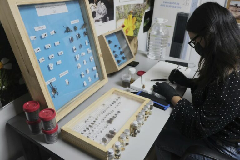 Una especialista analiza insectos y otros animales invertebrados recolectados de enterramientos clandestinos en Jalisco, que son estudiados como parte de un proyecto para ayudar en la búsqueda de personas desaparecidas en México durante décadas de violencia de los cárteles, en Guadalajara, México, el viernes 11 de julio de 2025. (AP Foto/Alejandra Leyva)