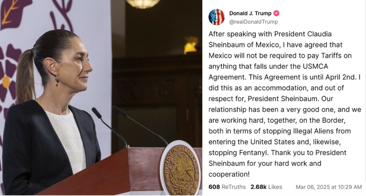 “Después de hablar con la presidenta de México, Claudia Sheinbaum, acordamos que México no tendrá que pagar aranceles sobre nada que esté incluido en el Acuerdo T-MEC. Este acuerdo es válido hasta el 2 de abril. Lo hice como una forma de adaptación y por respeto a la presidenta Sheinbaum. Nuestra relación ha sido muy buena y estamos trabajando duro, juntos, en la frontera, tanto en términos de impedir que los inmigrantes ilegales ingresen a los Estados Unidos como, asimismo, de detener el fentanilo. ¡Gracias, presidenta Sheinbaum, por su arduo trabajo y cooperación!”, escribió en sus redes sociales.