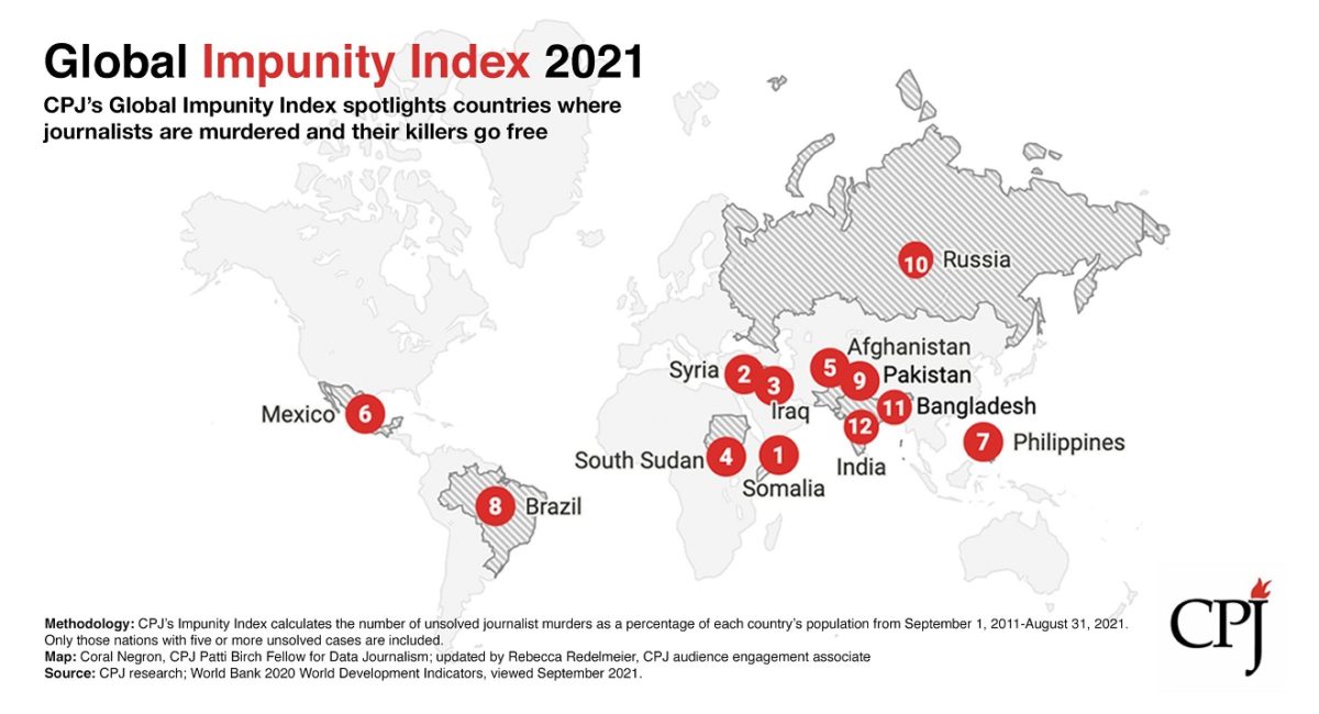 En su informe ‘Índice de impunidad global’ del Comité para la Protección de los Periodistas (CPJ, por sus siglas en inglés) reportó que Somalia, Siria, Irak y Sudán del Sur son los países en donde “se perpetúa el ciclo de violencia contra los periodistas”.