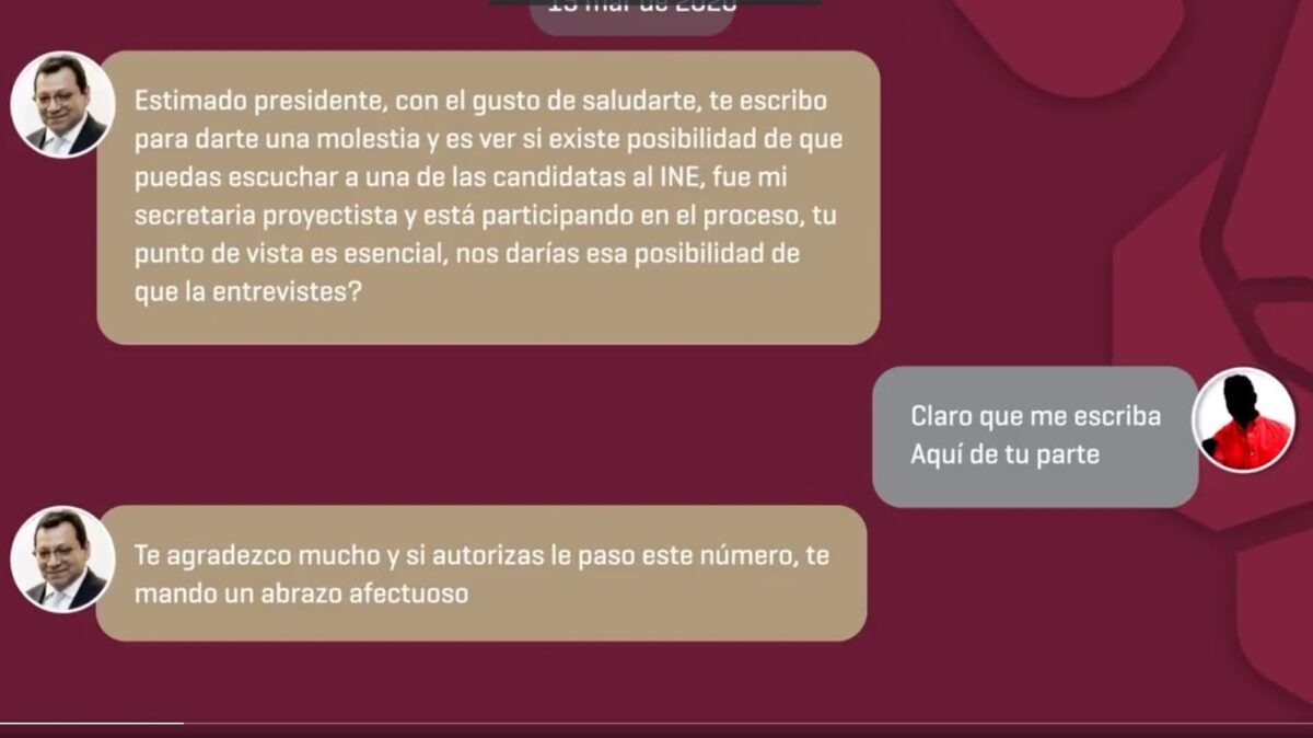 El primer mensaje revelado tuvo lugar presuntamente el 15 de marzo de 2020, en este, el magistrado Felipe Fuentes le solicita a Alejandro Moreno si puede “escuchar a una de las candidatas del INE” que participaban en ese momento para incorporarse al Instituto Electoral. El dirigente del PRI responde positivamente a la solicitud y el magistrado le agradece mucho y le manda un “saludo afectuoso”.