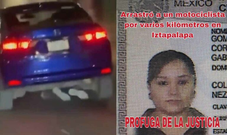 Una mujer automovilista arrolló y arrastró a un motociclista hasta provocarle la muerte en calles de la alcaldía Iztapalapa de la Ciudad de México, tras darse a la fuga aún no ha sido localizada.