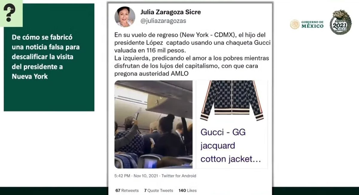 “Primero, difundieron una fotografía en la que se podía ver al presidente en un vuelo de regreso a la Ciudad de México conversando con una persona que portaba una chamarra Gucci valuada en más de 100 mil pesos. No pasó mucho tiempo para que se publicara esa imagen señalando falsamente que se trataba del hijo del presidente quien portaba la famosa chamarra Gucci. De inmediato se desató una campaña de desinformación, incluso le entraron medios de comunicación como Infobae, El Sol de Puebla, Vanguardia, Debate, MTP Noticias, Criterio, Línea Directa y Posta. Por supuesto, la oposición y los críticos de siempre hicieron eco de esta mentira.