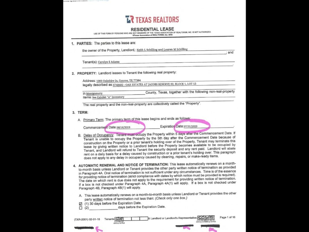 De acuerdo con documentos en poder de este diario, la residencia situada en 1003 Oakshire In, Conroe, Texas, en un suburbio de Houston, fue rentada en forma regular mediante un contrato de arrendamiento entre sus propietarios, Keith L. Schilling y Lauren M. Schilling, y a Carolyn Adams, esposa de José Ramón López Beltrán.