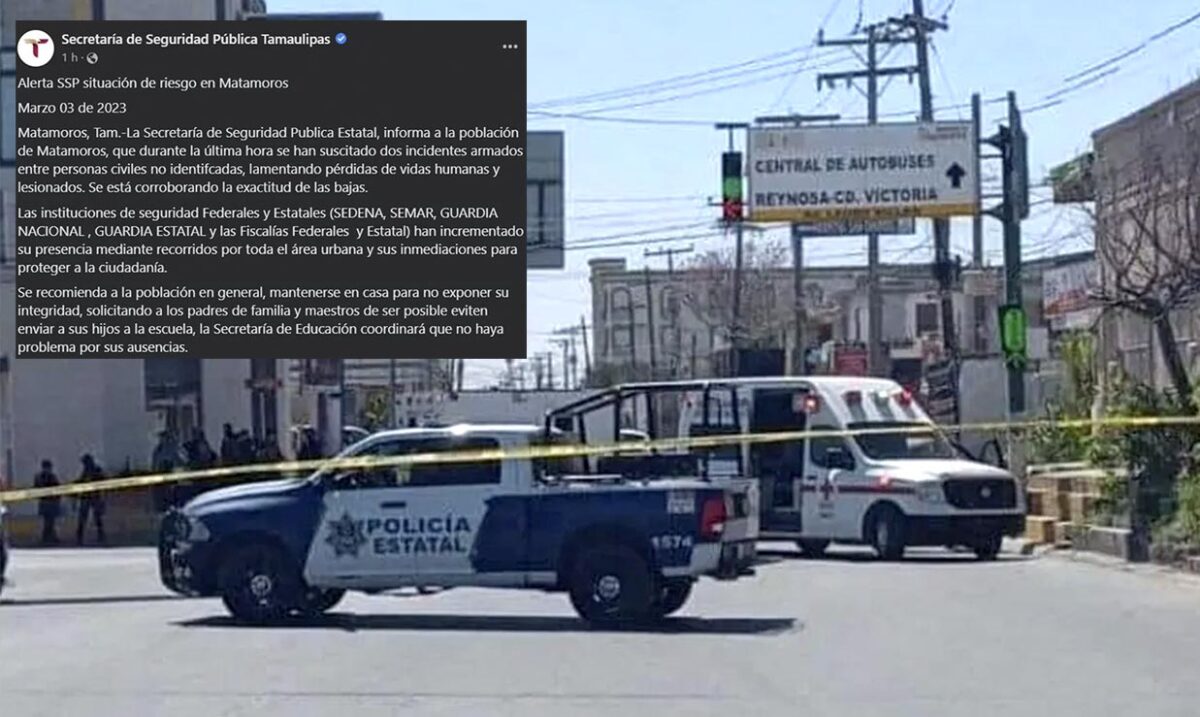 La Secretaría de Seguridad Pública de Tamaulipas dijo que elementos militares, de Marina, Guardia Nacional, así como Guardia Estatal están recorriendo el área urbana de Matamoros, para “proteger a la ciudadanía”.