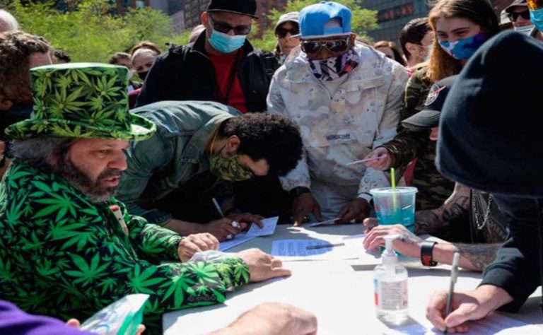 Según los activistas, lo que pretendían era celebrar la legalización de la marihuana para uso recreativo en el estado de Nueva York y apoyar la campaña de vacunación este 20 de abril, día festivo oficioso del cannabis.