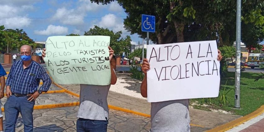 Con carteles exigiendo justicia, los manifestantes denunciaron ser víctimas de violencia por parte de taxistas ‘de la franja verde’ sobre todo dentro de la zona hotelera, ya que con su monopolio no permiten a los cancunenses decidir qué medio de transporte pueden utilizar.