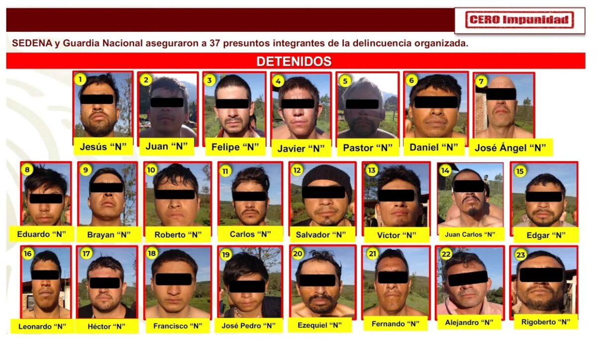 “En donde se localizó una construcción que era utilizada por integrantes de la delincuencia organizada para su resguardo, por lo que se estableció un cerco de seguridad y se pudo detener en flagrancia y sin enfrentamiento a 37 sujetos con armas de fuego, cargadores, cartuchos, granadas y equipo táctico balístico”, dijo el subsecretario.