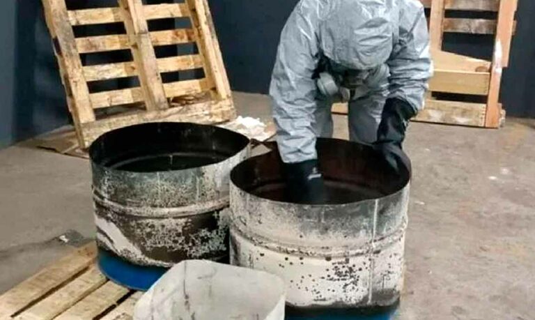 Además de la droga sintética, durante los cateos —realizados bajo mandato judicial como parte de una investigación en curso— también se encontraron 44 tambos con capacidad de 200 litros cada uno, que contenían metilamina, un precursor químico fundamental para la fabricación de metanfetamina.