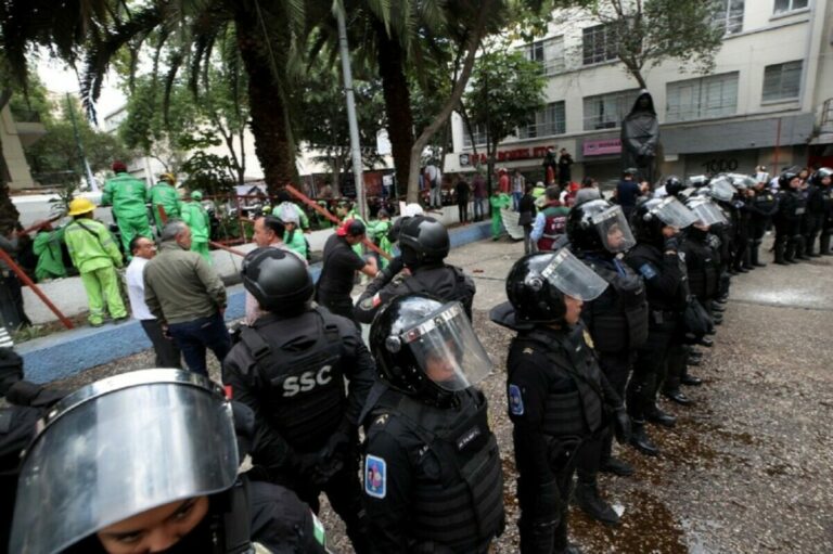 A las 13 horas de ayer, un centenar de efectivos de la Secretaría de Seguridad Ciudadana con cascos y escudos se apostaron en el área de conservación patrimonial para resguardar la integridad física de los trabajadores del gobierno capitalino que retiraban los objetos metálicos y que fueron agredidos por gente que portaba camisetas con el logotipo de la alcaldía Cuauhtémoc.