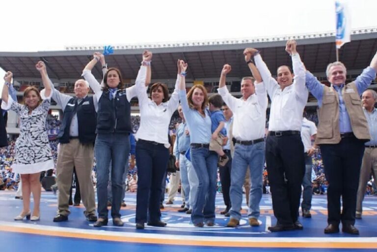 Aliados de las peores causas, lo único que les interesa es el bien propio y el de sus familias. Ana Lucía Medina Galindo (al centro cargando a su hijo) en su cierre de campaña en noviembre de 2011 junto a Josefina Vázquez Mota, Luisa María Calderón, Marko Cortés y Santiago Creel.