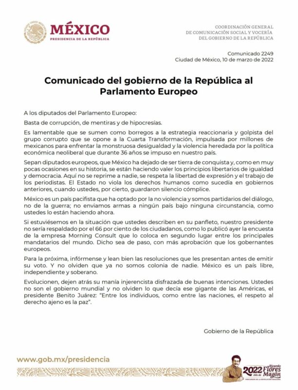 Asimismo, ante los señalamientos hechos por los eurodiputados respecto a los periodistas y defensores de derechos humanos en el país, el Gobierno de México emitió anoche su postura a través de un comunicado. En el escrito señala textual, lo siguiente: