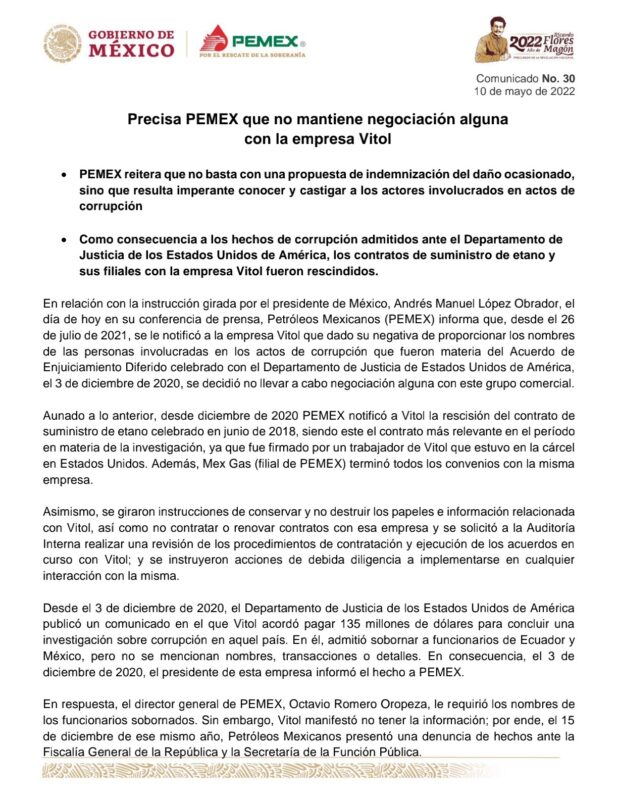 Luego de que el presidente Andrés Manuel López Obrador señaló en su conferencia matutina que vetará a la firma energética si no revela los nombres de los implicados en casos de corrupción, la petrolera mexicana indicó en un comunicado que desde el 26 de julio de 2021 notificó a Vitol, ante su negativa de proporcionar la información requerida, que no realizaría negociación alguna.