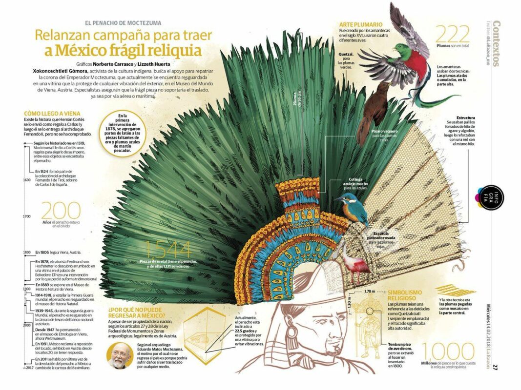 —Que es algo que le pertenece al pueblo de México es patrimonio nuestro, que se sustrajo ese penacho como muchas otras cosas y piezas. Aunque no sé si ustedes conozcan la historia sobre el tema. Hay especialistas que han hecho todo el análisis de la entrega del penacho, cómo llega el penacho a Austria, sostienen que fue en el tiempo de Maximiliano, y al mismo tiempo ya que está Maximiliano como emperador de México, solicita le presten el penacho, y no se lo prestan. Esto lo sostiene un historiador, novelista, Fernando del Paso, que escribió un gran libro Noticias del Imperio.