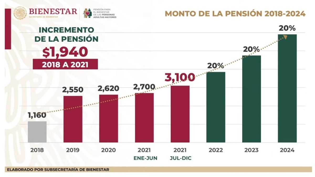 Pensión se incrementó a 1,940 pesos de 2018 a 2021