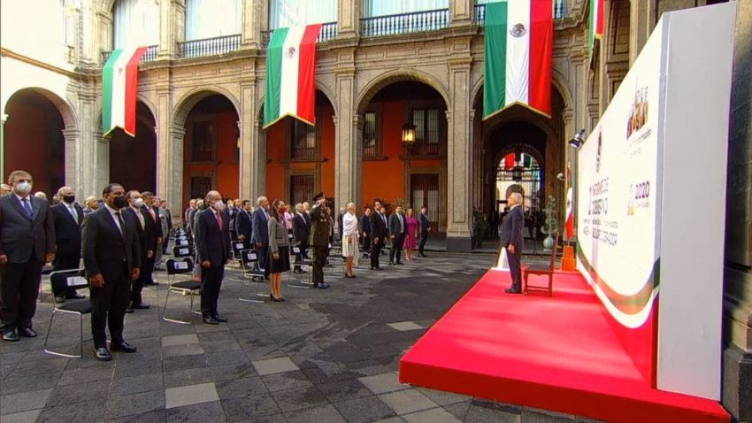 En el patio de honor de Palacio Nacional, acompañado de su gabinete, invitados especiales de los sectores obrero, empresarial y grupos indígenas, López Obrador dijo que la austeridad republicana es una realidad de hechos, no de palabras pues ya no hay lujos en el gobierno. El mandatario señaló que en su momento se le ha reprochado que no se emprendió un rescate económico, pero es un timbre de orgullo decir que ayudamos a 23 millones de familias con al menos uno de los programas sociales, sean pensiones para adultos mayores, becas a estudiantes o apoyos a niños con discapacidad.