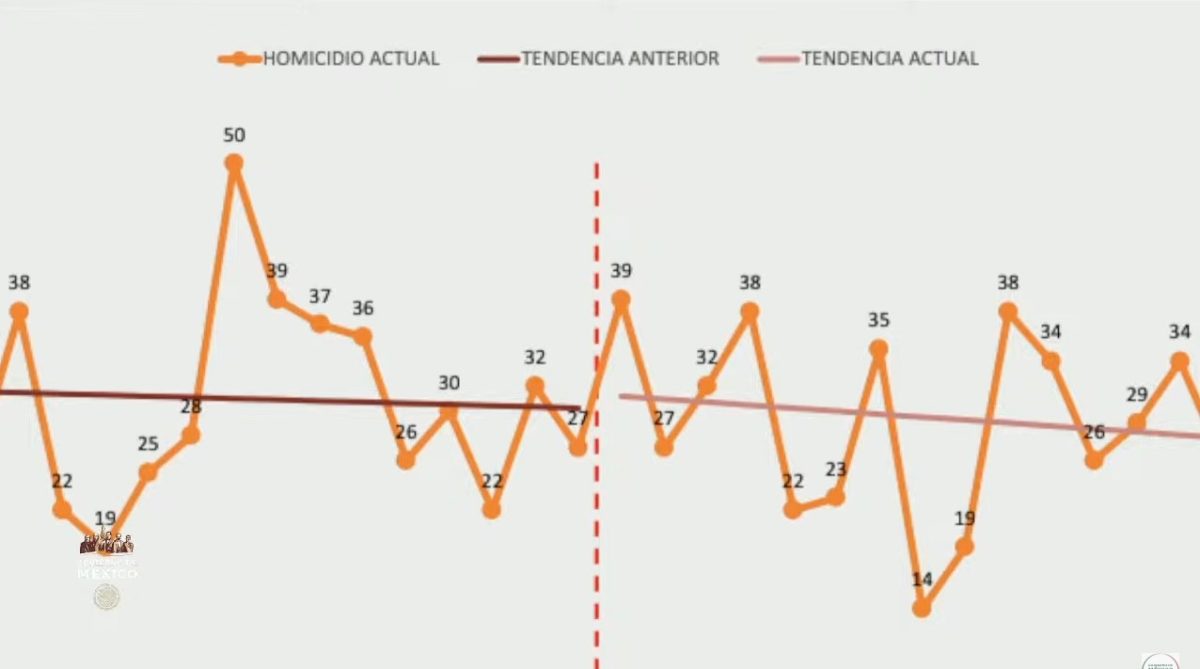 Después de la reunión del gabinete de seguridad y frente al presidente Andrés Manuel López Obrador el mandatario estatal indicó: “Pongo una gráfica sobre el comportamiento de las denuncias por homicidio en el 911. Esta es la tendencia de los 150 días anteriores a mi gobierno y esta es la tendencia de los 150 días de mi gobierno.