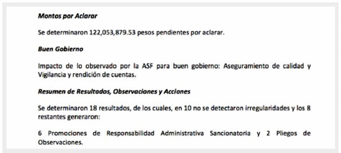 La Auditoría encontró en la revisión del gasto que el dinero no se reintegró de manera adecuada a la Tesorería de la Federación; hubo gastos injustificados; pagos por servicios que no se sabe si se recibieron y en general, opacidad en el gasto.