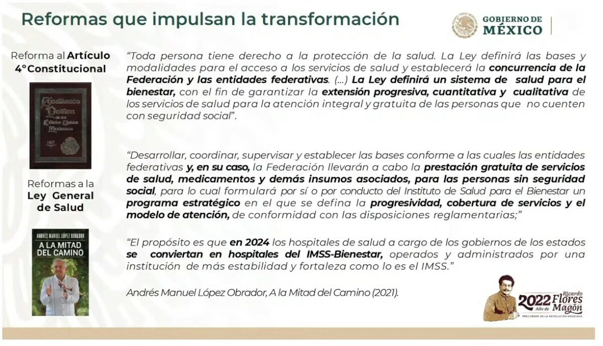 Después, en los años ochenta, tras un proceso de descentralización de los servicios (cuando cada entidad asumía la responsabilidad de suministrarlos) y después de poner en marcha otras etapas del esquema con distintos nombres, ahora el eje se denomina IMSS-Bienestar.