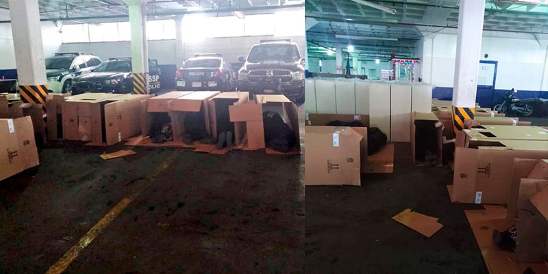Policías duermen en cajas de cartón por faltar a trabajar en Navidad y Año Nuevo.- Más de cien elementos de la Secretaría de Seguridad y Protección de la Ciudadanía de México durmieron en cajas de cartón o sobre éstas en un estacionamiento.