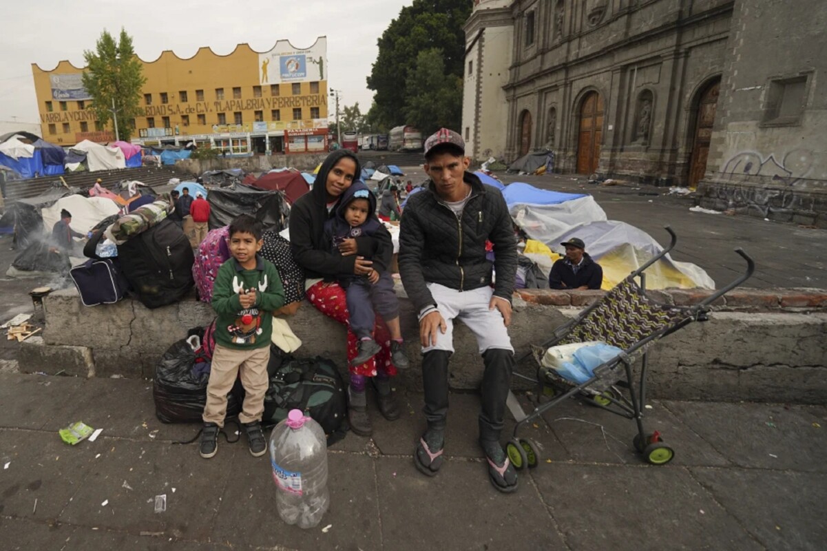 La familia Aguilar Bastida, procedente de Venezuela, fuera de la iglesia de la Santa Cruz y La Soledad, en donde algunos migrantes acampan, el martes 26 de diciembre de 2023, en Ciudad de México. (AP Foto/Marco Ugarte)