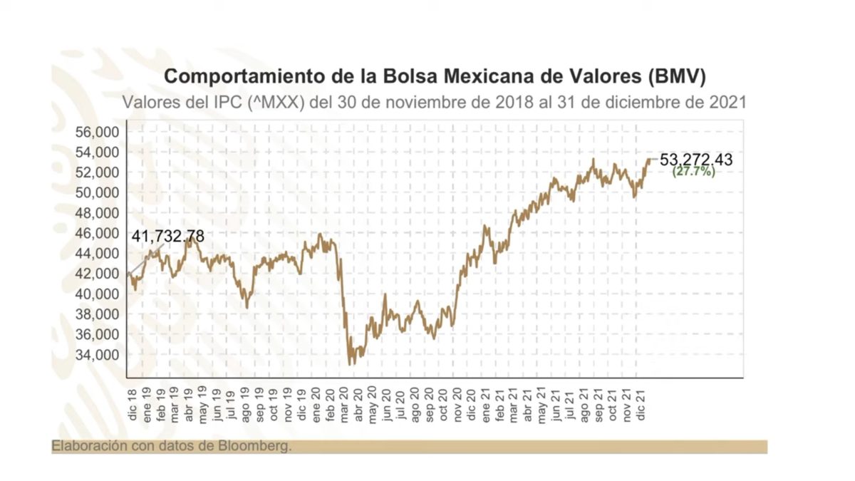 Junto con Carlos Torres Rosas, secretario técnico del Gabinete y coordinador general de Programas Integrales de Desarrollo, encargado de la elaboración del balance presentado en el Salón Tesorería, López Obrador difundió de nueva cuenta los resultados de la Bolsa Mexicana de Valores, que “es bastante alentador» porque, aunque se cayó con el inicio de pandemia, posteriormente subió, y del 30 de noviembre de 2018 al 31 de diciembre de 2021 se registran ganancias del 27.7 por ciento.