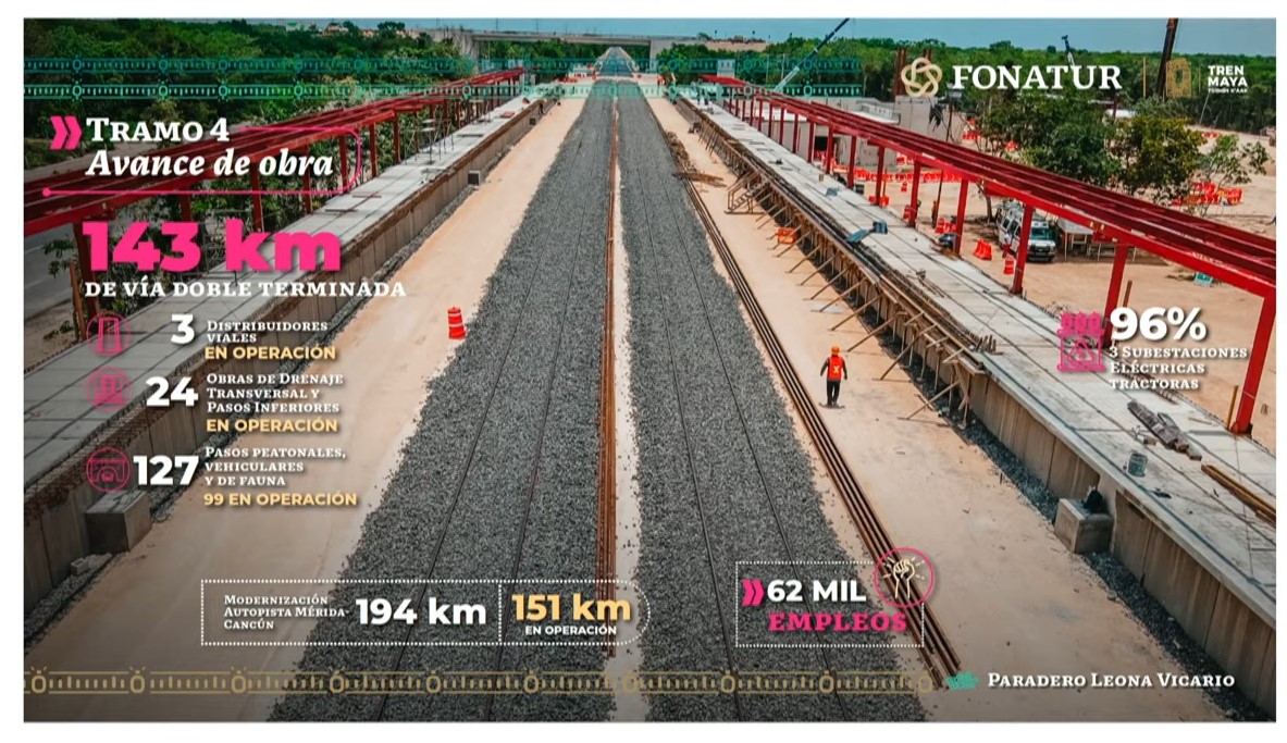 El tramo 4 del Tren Maya que va de Izamal a Cancún y que recorre 239 kilómetros de vía doble electrificada pasa por 9 municipios de Yucatán y Quintana Roo, presenta un avance general del 93 % con 143 mil kilómetros de vía doble terminada.