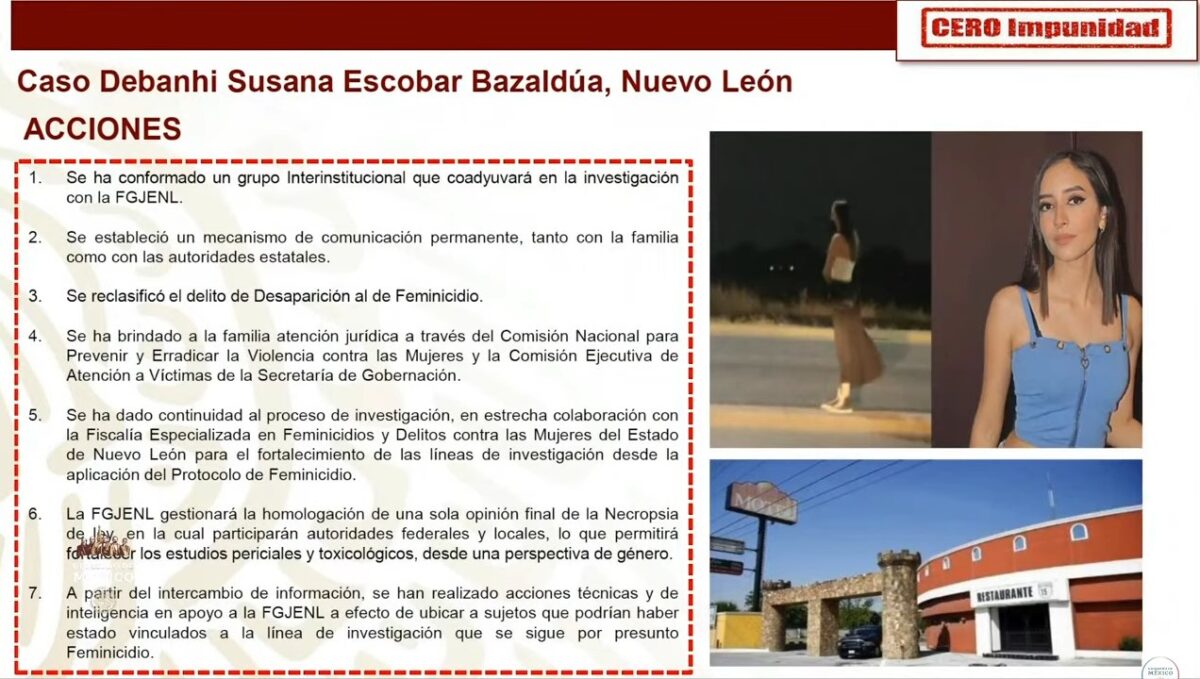 Por otra parte, Ricardo Mejía informó que en coordinación con la Fiscalía General del Estado (FGE) de Nuevo León se investiga a “sujetos que podrían estar vinculados” con el caso Debanhi Escobar.