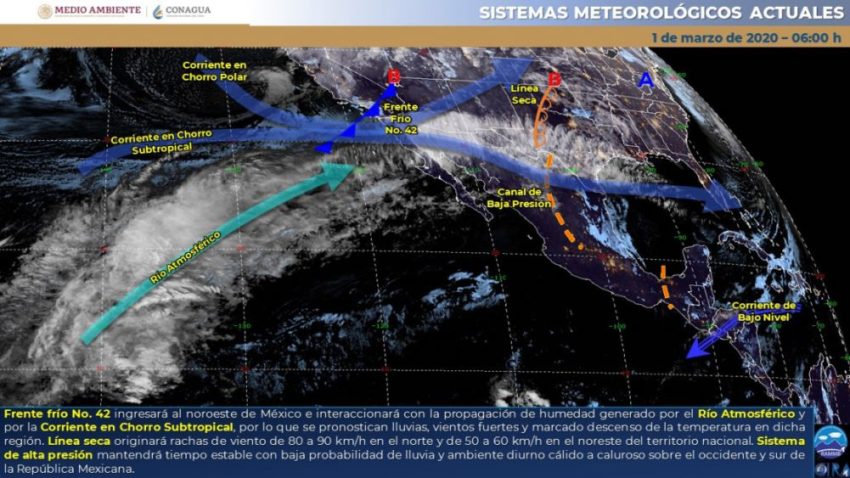 Pronóstico del clima para hoy domingo 1 de marzo. Para hoy, el frente frío No. 42 ingresará en el noroeste de México e interaccionará con un vórtice de núcleo frío en la atmósfera superior y con la humedad aportada por un río atmosférico, dando origen a la décima tormenta invernal de la temporada sobre dicha región del país.