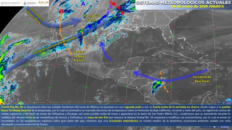 El frente frío No. 30 se desplazará sobre los estados fronterizos del norte de México, se asociará con una vaguada polar y con un fuerte pulso de la corriente en chorro, dando origen a la posible sexta tormenta invernal de la temporada.