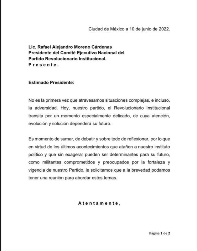 Otro de los escenarios previstos es que en su peor momento al frente de la dirigencia del PRI, Alito Moreno recibe al “brazo fuerte” del priísmo, destacados personajes que le acercaron una misiva requiriéndole el encuentro para expresar sus opiniones sobre el duro momento del tricolor.