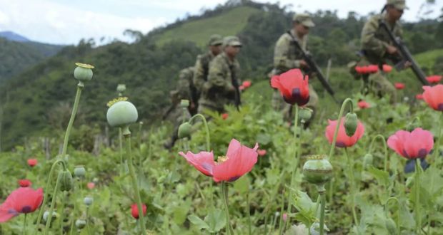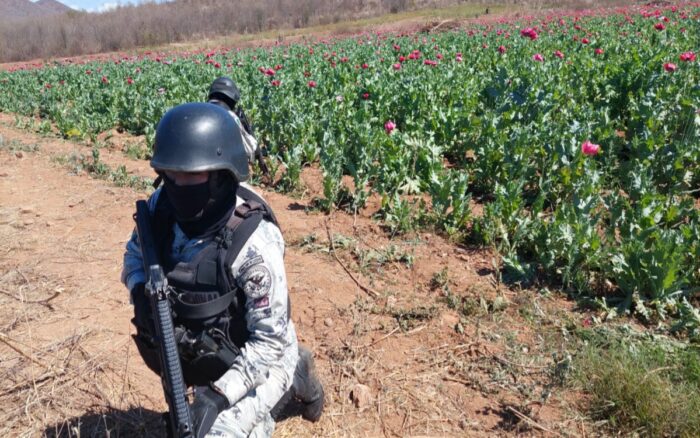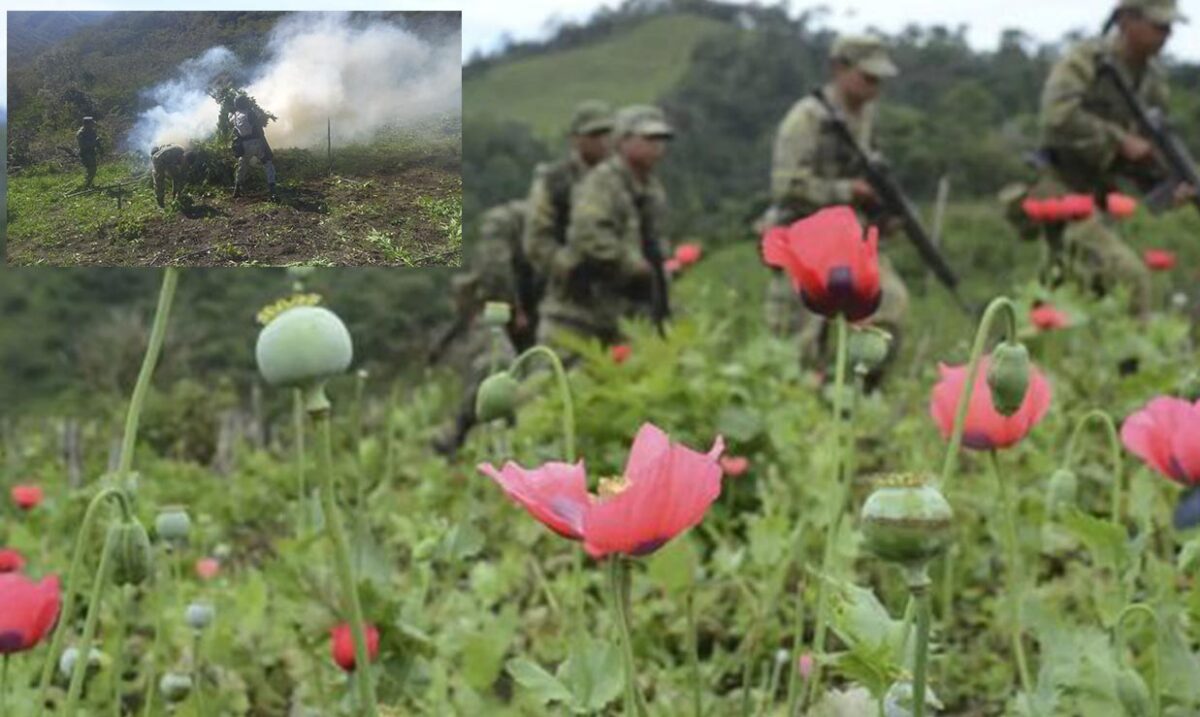 En un comunicado difundido este miércoles, la dependencia castrense señaló que en coordinación con policías de la Guardia Nacional, los soldados localizaron la plantación de esta flor que se usa como materia prima de la goma de opio.