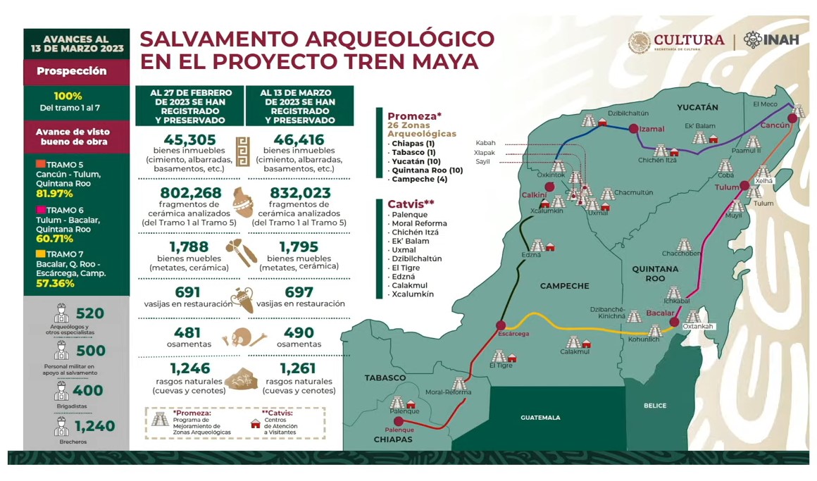 Durante el informe semanal sobre el Tren Maya, el titular del INAH reportó que hasta el 13 de marzo se registraron y preservaron: