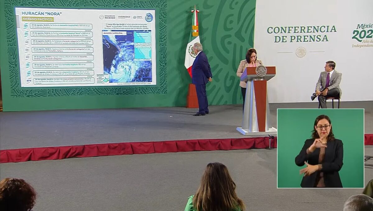 “Informamos a la población sobre el trayecto del huracán Nora, que inició el pasado miércoles 25 de agosto sobre las costas del océano Pacífico. Este huracán tocó a seis estados, los mismos que fueron atendidos con antelación, con acciones preventivas y en el momento que iba pasando el huracán.