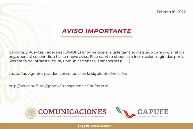 Recula Capufe en aumento a las casetas de peaje. Caminos y Puentes Federales (Capufe), suspendió este miércoles y hasta nuevo aviso, el ajuste tarifario instruido para iniciar el día de hoy, el cual sería de un aumento de hasta 13 por ciento en los peajes de autopistas.