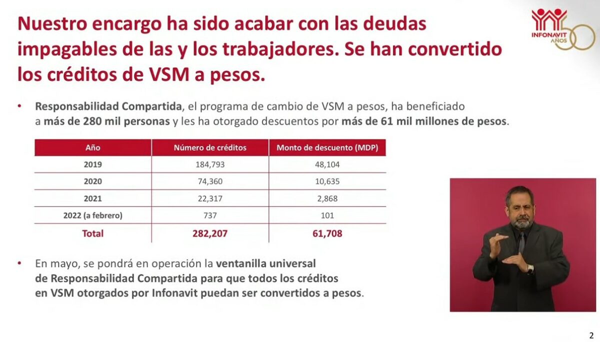 La que sigue. Recordarle a la gente que hemos estado convirtiendo los créditos que estaban en salarios mínimos, los hemos convertido a pesos. Al día de hoy se han convertido 282 mil créditos y se han condonado deudas en saldos por 61 mil millones de pesos.