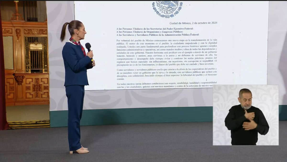 La Presidenta Claudia Sheinbaum leyó en la Mañanera del Pueblo una carta que envió a todas y todos los servidores públicos de la administración pública federal el 2 de octubre, primer día de su gobierno, en la que los instó a dirigirse con respeto, luchar contra la corrupción, actuar con ética y honradez, entre otros señalamientos.