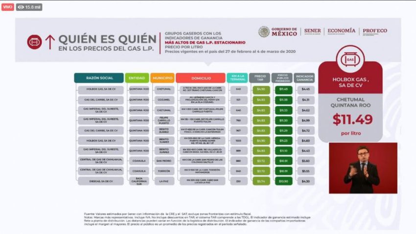 La venta para tanques estacionarios donde el precio por litro es de 11.24 por litro, las gaseras tienen un margen de ganancia de 4.31 hasta 5.06 pesos, esto en al menos 4 municipios: Cozumel, Felipe Carrillo Puerto, Chetumal y Benito Juárez.