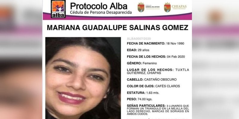 La periodista Mariana Guadalupe Salinas Gómez fue reportada como desaparecida por su familia el pasado 4 de febrero, luego de que salió sin dar aviso de su vivienda, en Tuxtla Gutiérrez, Chiapas.
