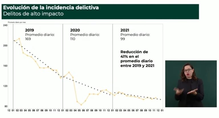 “Esta es la evolución de la incidencia delictiva de los delitos de alto impacto, todos los delitos del 2019 a la fecha hemos pasando de 169 delitos promedio diario a 99 delitos promedio diario, una reducción del 41 por ciento”, mencionó la jefa de Gobierno.