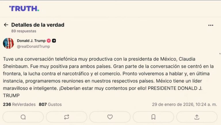 “Tuve una conversación telefónica muy productiva con la presidenta de México, Claudia Sheinbaum. Fue muy positiva para ambos países. Gran parte de la conversación se centró en la frontera, la lucha contra el narcotráfico y el comercio. Pronto volveremos a hablar y, en última instancia, programaremos reuniones en nuestros respectivos países. México tiene un líder maravilloso e inteligente. ¡Deberían estar muy contentos por ello!” PRESIDENTE DONALD J. TRUMP.