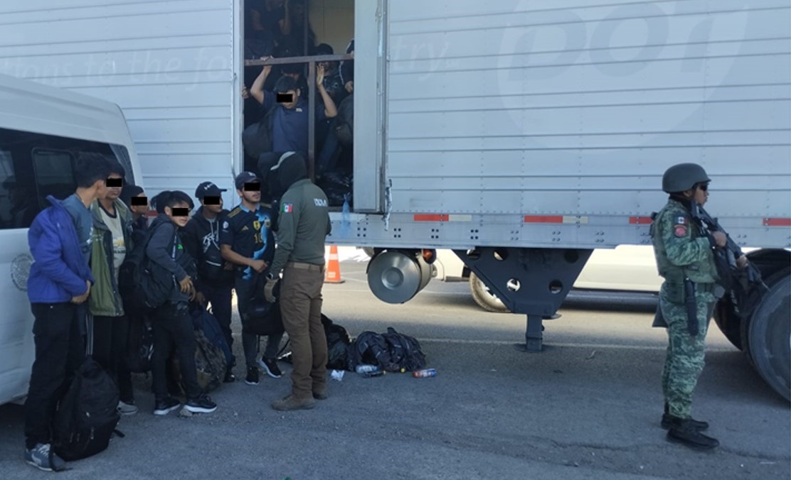 Agentes del Instituto Nacional de Migración (Inami), establecidos en el Puesto Militar de Seguridad “Sacramento”, ubicado en el municipio de Chihuahua, con el apoyo de integrantes del Ejército Mexicano como seguridad periférica al inspeccionar un tractocamión con doble semirremolque, localizaron en su interior a los migrantes.