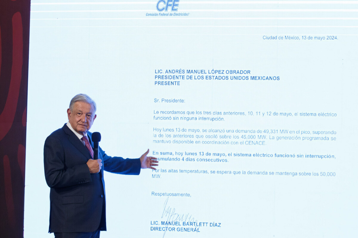 Dio a conocer un oficio que le envió el titular de la Comisión Federal de Electricidad (CFE), Manuel Bartlett, en el que le hace saber que pese a una demanda de casi 50 mil megawatts (MW) del lunes, el sistema eléctrico funcionó sin interrupción.