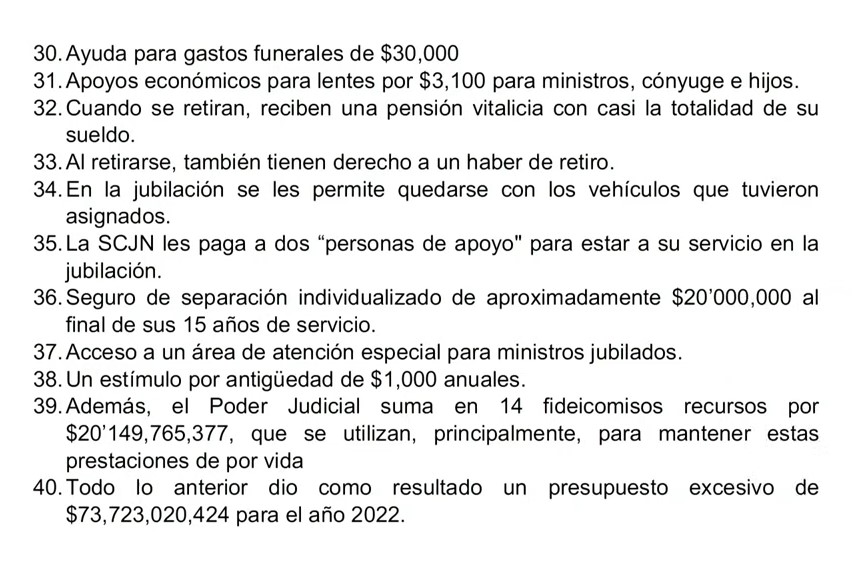 De entrada, 14 fideicomisos por un monto acumulado de 20 mil millones de pesos (sería bueno que estos recursos se destinaran a becas para estudiantes de escasos recursos) para financiar todos los excesos; aguinaldos de 588 mil pesos. “Para que vean que no hay estado de derecho, como sostienen los abogados leguleyos, huizacheros, que están defendiendo a los jueces, ministros y magistrados”.