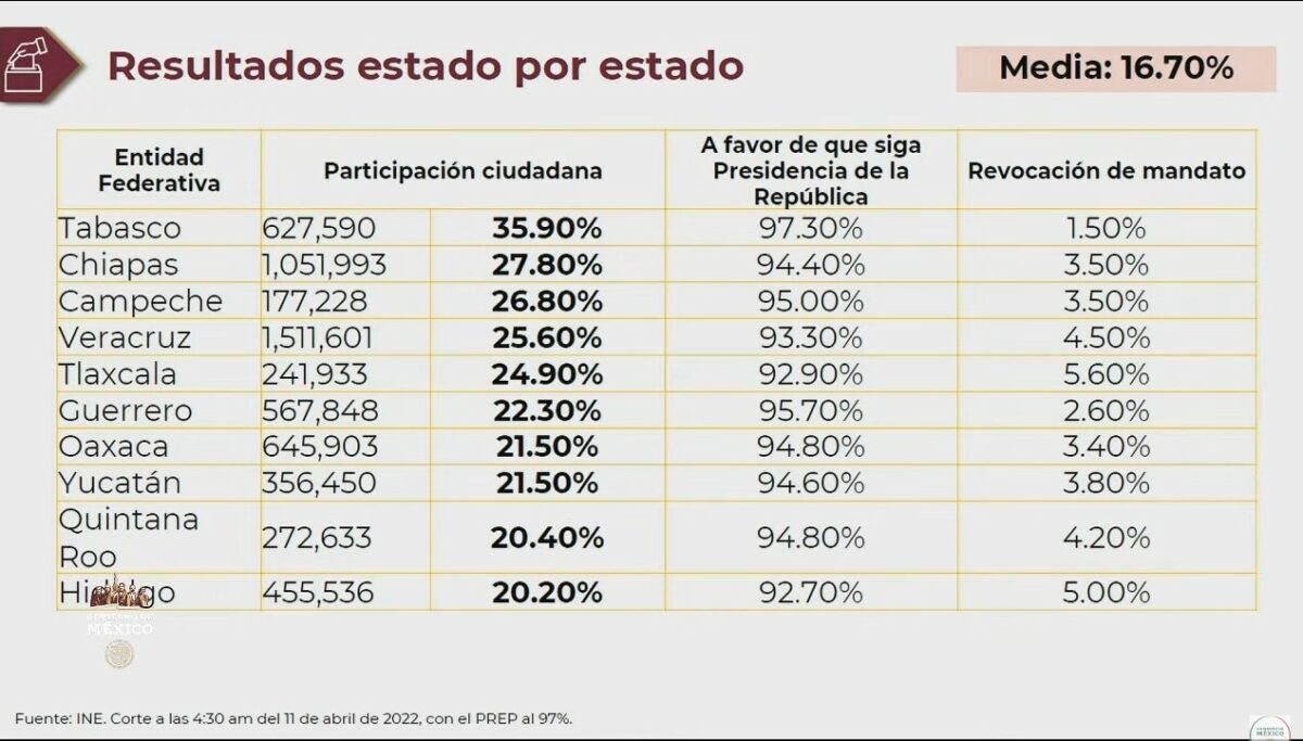 En su desglose de la información del INE, refirió que Tabasco presentó la mayor participación con un porcentaje de 35.90, con 627 mil votos; Chiapas, 27.80, con un millón 51 mil personas y en el otro extremo, en Guanajuato, participó el 9.5 por ciento con 431 votantes; y Jalisco, 9 por ciento con 550 mil.